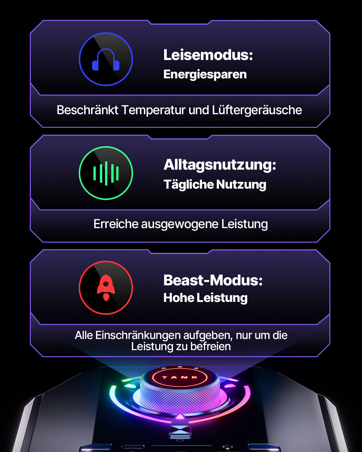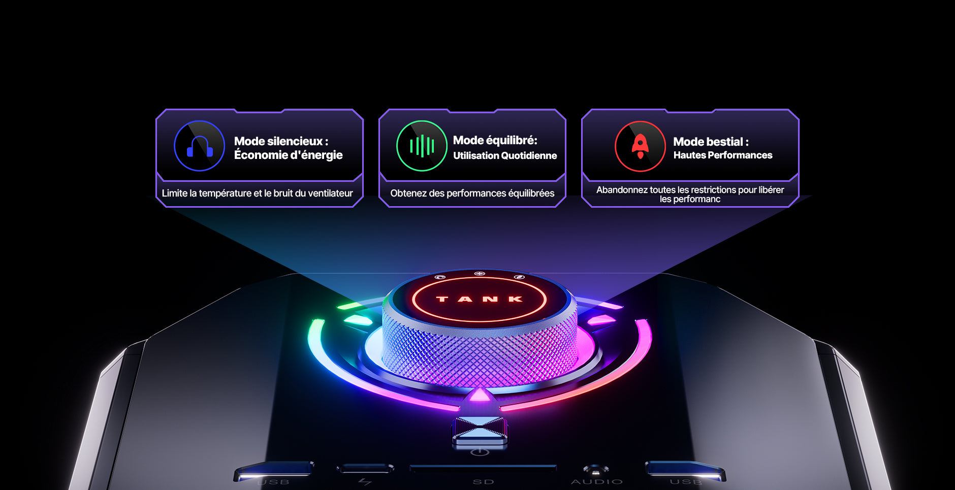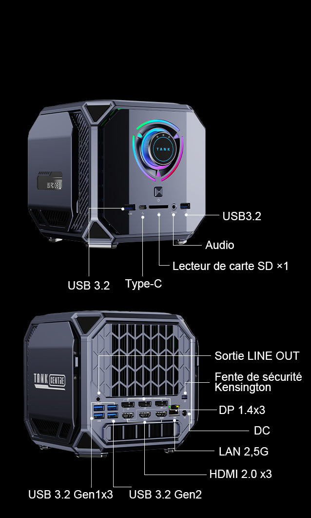 | Ports & boutons | Ethernet RJ45 Gigabit adaptatif 10 M / 100 M / 1000 M / 2,5 Gbps ×1 USB 3.2 Gen 2 Type-A ×3 USB 3.2 Gen 1 Type-A ×3 USB 4.0 Type-C ×1 (8K@60Hz) Entrée d’alimentation DC ×1 HDMI 2.0 ×3 (4K@60Hz) DisplayPort 2.0 ×3 (8K@60Hz) Prises audio 3,5 mm ×2 |
