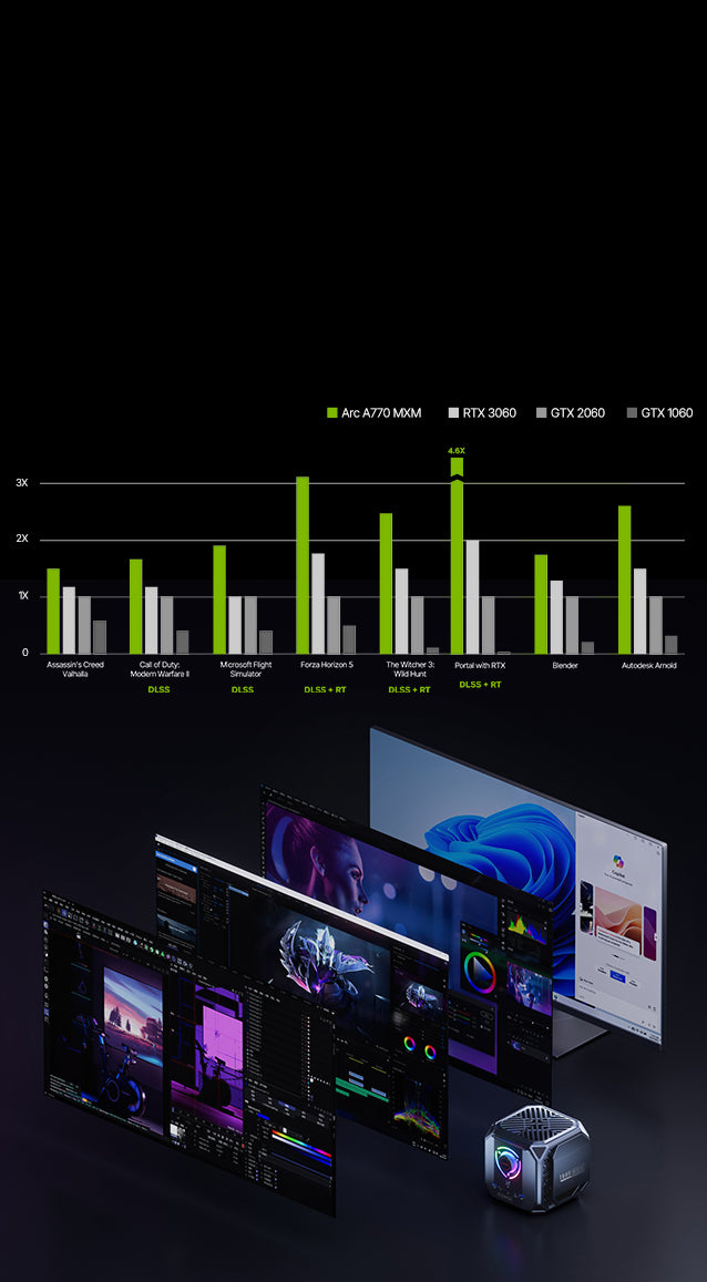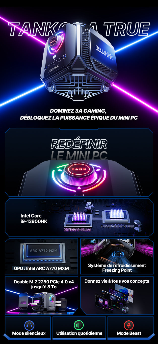 Le M1A PRO est équipé d'un processeur Intel Core i9-13900HK avec 14 cœurs et 20 threads. La carte graphique intégrée Intel ARC A770 prend en charge des technologies avancées telles que le ray tracing, le DLSS et Reflex pour des effets visuels et des performances impressionnants.