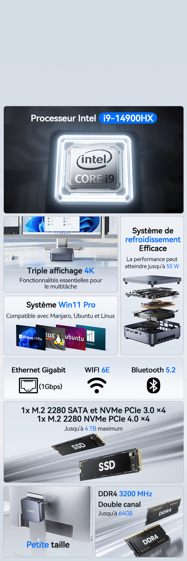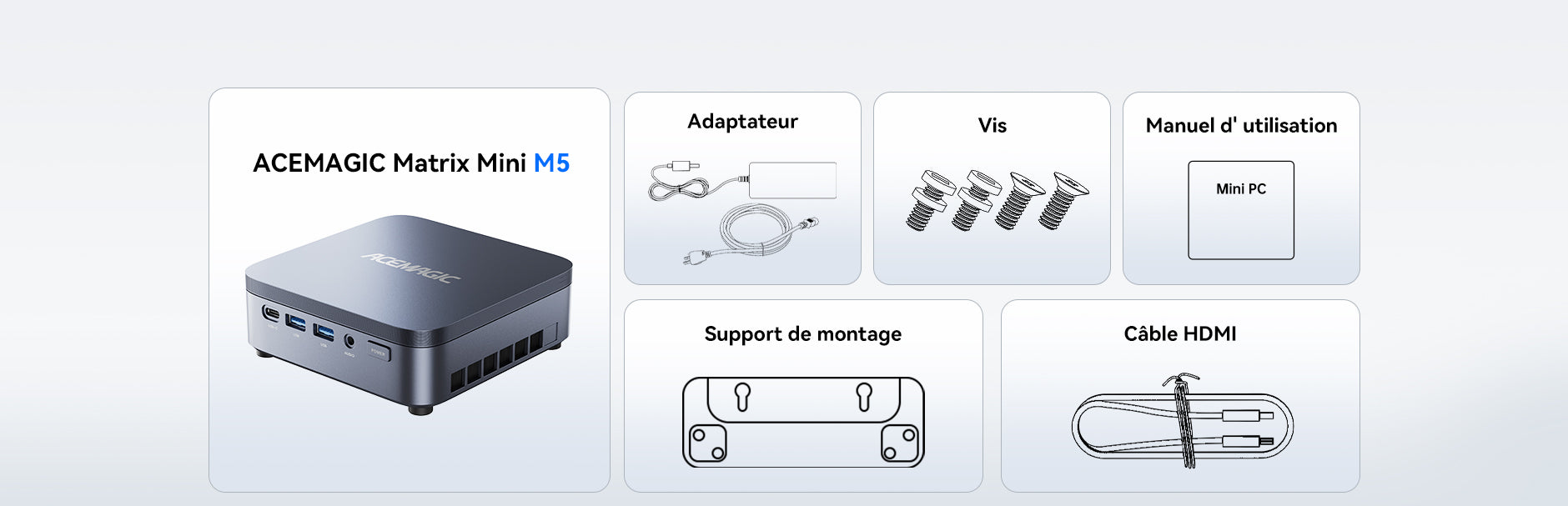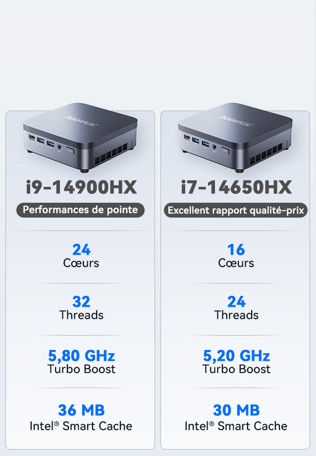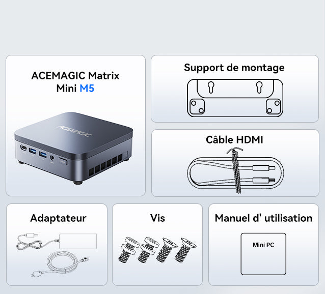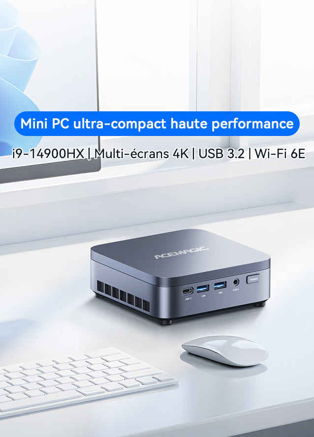 ACEMAGIC Matrix Mini M5 est un mini-PC puissant, équipé d’un processeur Intel® Core™ i9-14900HX. Avec 32 GB de mémoire DDR4 et un SSD de 1 TB. Il prend en charge la sortie triple écran en 4K@60Hz, est compatible avec le Wi-Fi 6E et fonctionne sous Windows 11 Pro.