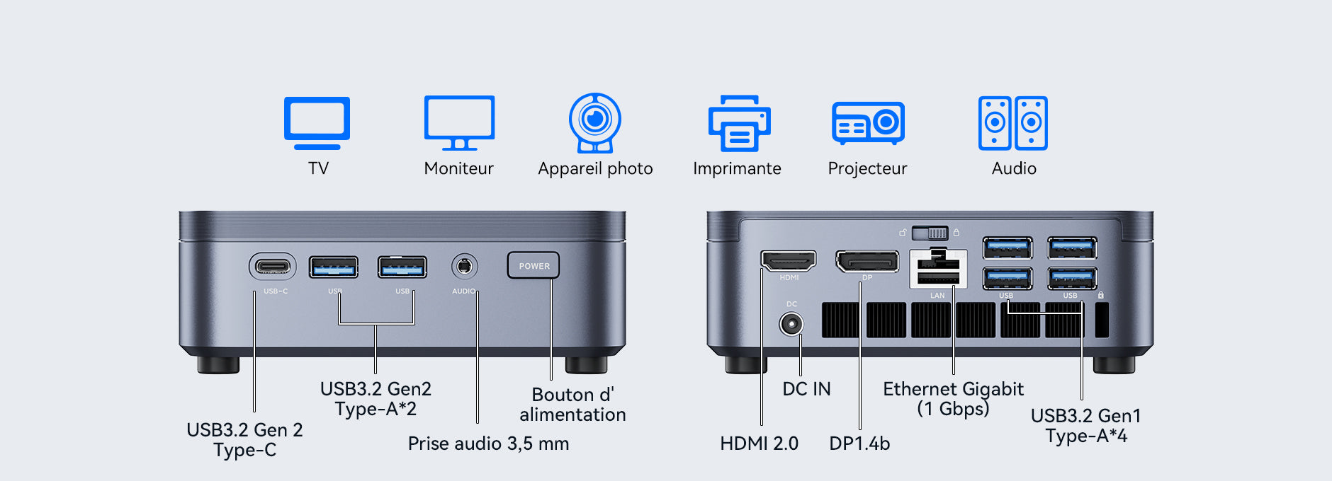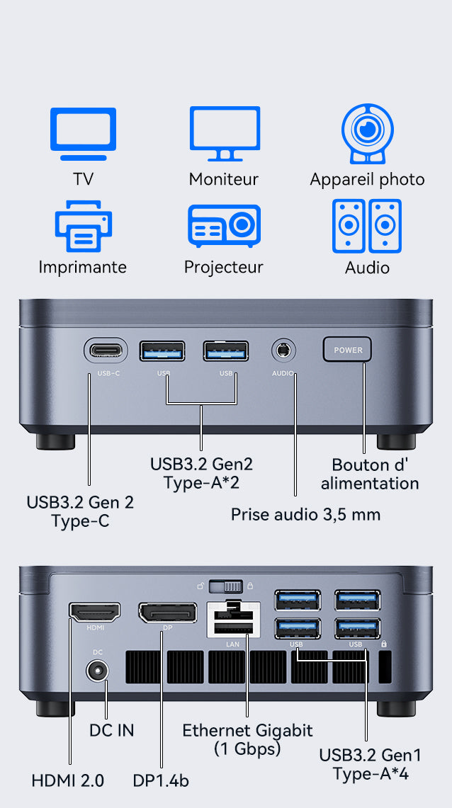 | Ports & boutons | Port Ethernet RJ45 10M/100M/1000M/2,5 Gbps USB 3.2 Gen2 Type-A ×2 (avant) USB 3.2 Gen1 Type-A ×4 USB3.2 Gen 2 Type-C ×1 (compatible DP 1.4b, 4K@120Hz, transfert jusqu’à 40 Gbit/s, sortie PD) Prise d'entrée DC ×1 HDMI 2.0 ×1 (4K@60Hz) DisplayPort 1.4b ×1 (4K@120Hz) Prise audio 3,5 mm ×1 Bouton d’alimentation ×1 |
