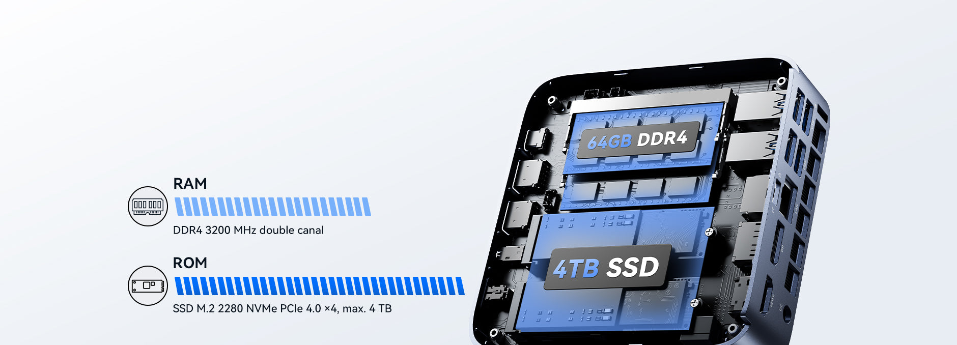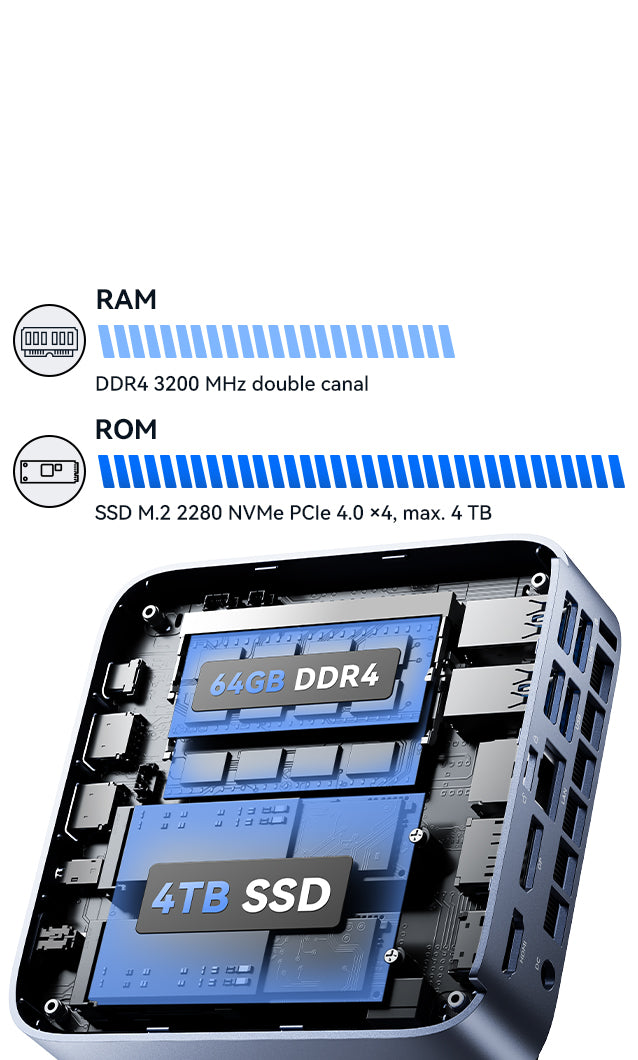 | Mémoire vive (RAM) | DDR4 3200 MHz double canal, emplacements DDR4 SO-DIMM*2, jusqu'à 64 GB, prend en charge une fréquence maximale de DDR4 3200 MHz |