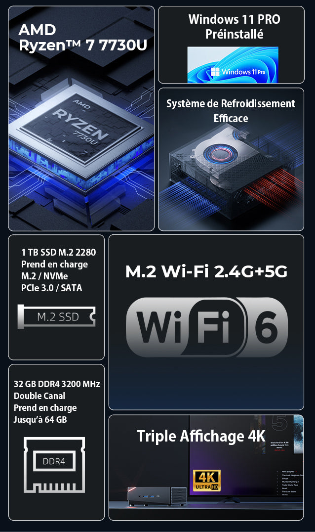 ACEMAGIC AM06 Pro est un mini-ordinateur performant équipé d'un processeur AMD Ryzen 7 7730U/5700U/5825U. Il convient parfaitement pour les jeux et dispose de 32 GB de RAM DDR4 et d'un SSD de 1 TB (extensible jusqu'à 2 TB). Il prend en charge une sortie vidéo triple 4K@60Hz via les interfaces HDMI, USB-C et DisplayPort, ainsi que deux ports Ethernet et le WiFi 6. Il fonctionne sous Windows 11.