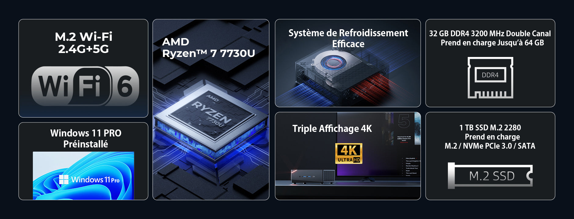 | Processeur | AMD Ryzen™ 7 7730U, 8 cœurs / 16 threads (architecture Zen3, procédé TSMC 7 nm FinFET, cache L3 de 16 MB, fréquence de base 2,0 GHz, fréquence Turbo jusqu’à 4,5 GHz) |