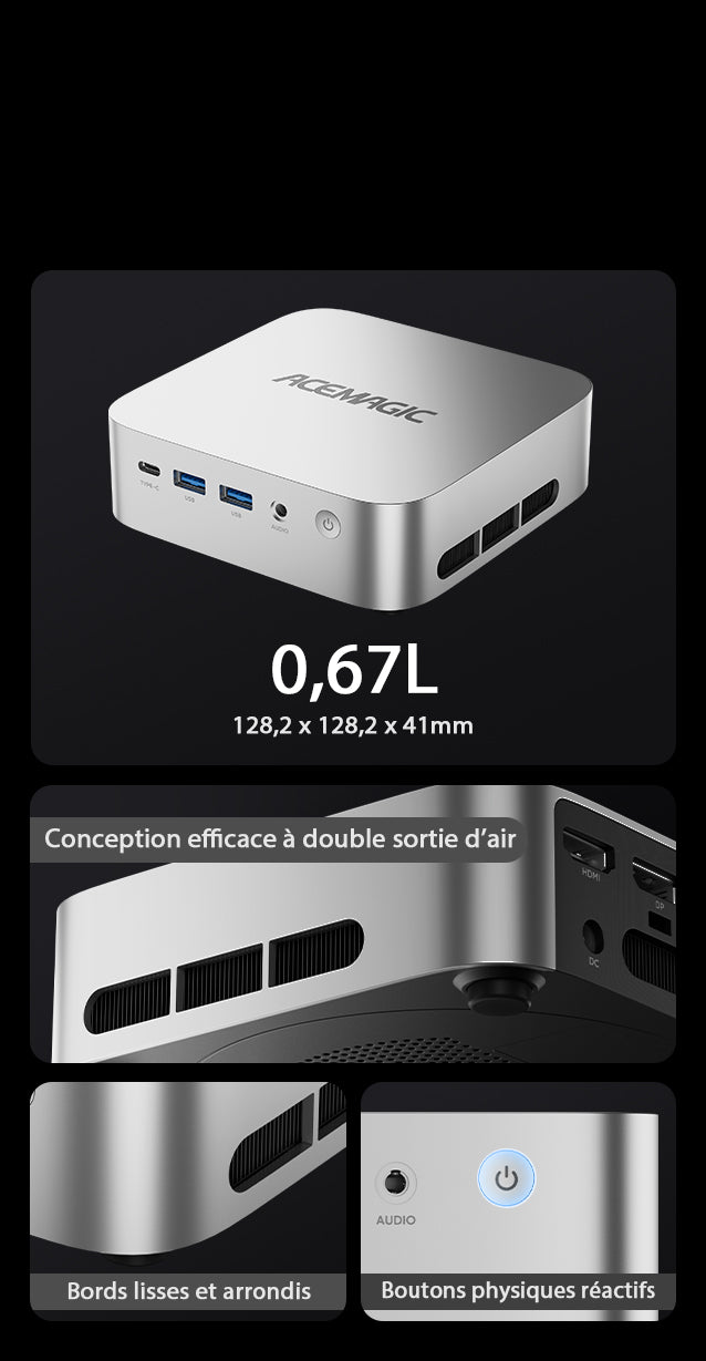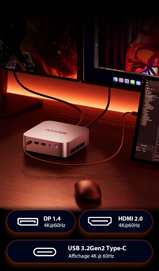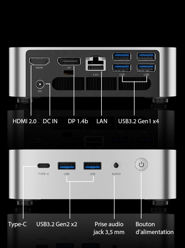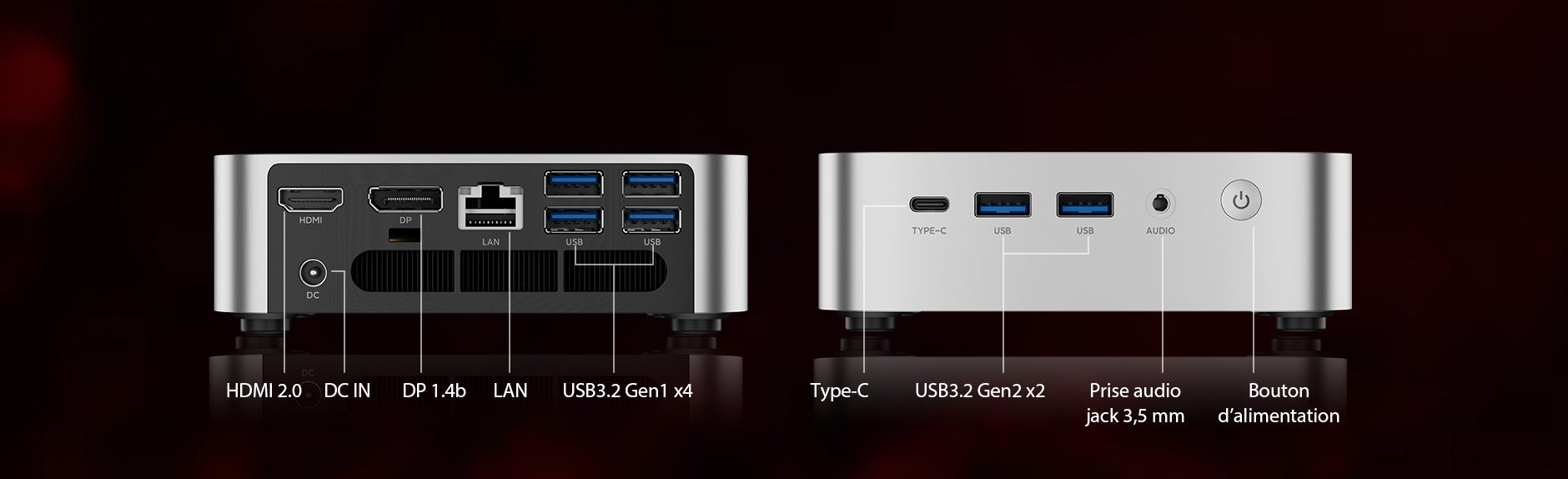 | Ports & boutons | Port Ethernet RJ45 Gigabit adaptatif 10M/100M/1000Mbps ×1 USB 3.2 Gen2 Type-A ×2 (10 Gbps, façade) USB 3.2 Gen1 Type-A ×4 (5 Gbps, arrière) USB 3.2 Gen2 Type-C multifonction (compatible DP 1.4, 4K@60Hz, transfert de données jusqu’à 10 Gbps, sortie PD) ×1 Entrée d’alimentation DC ×1 HDMI 2.0 ×1 (4K@60Hz) DisplayPort 1.4b ×1 (4K@60Hz) Prises audio 3,5 mm ×1 Bouton d’alimentation ×1 |