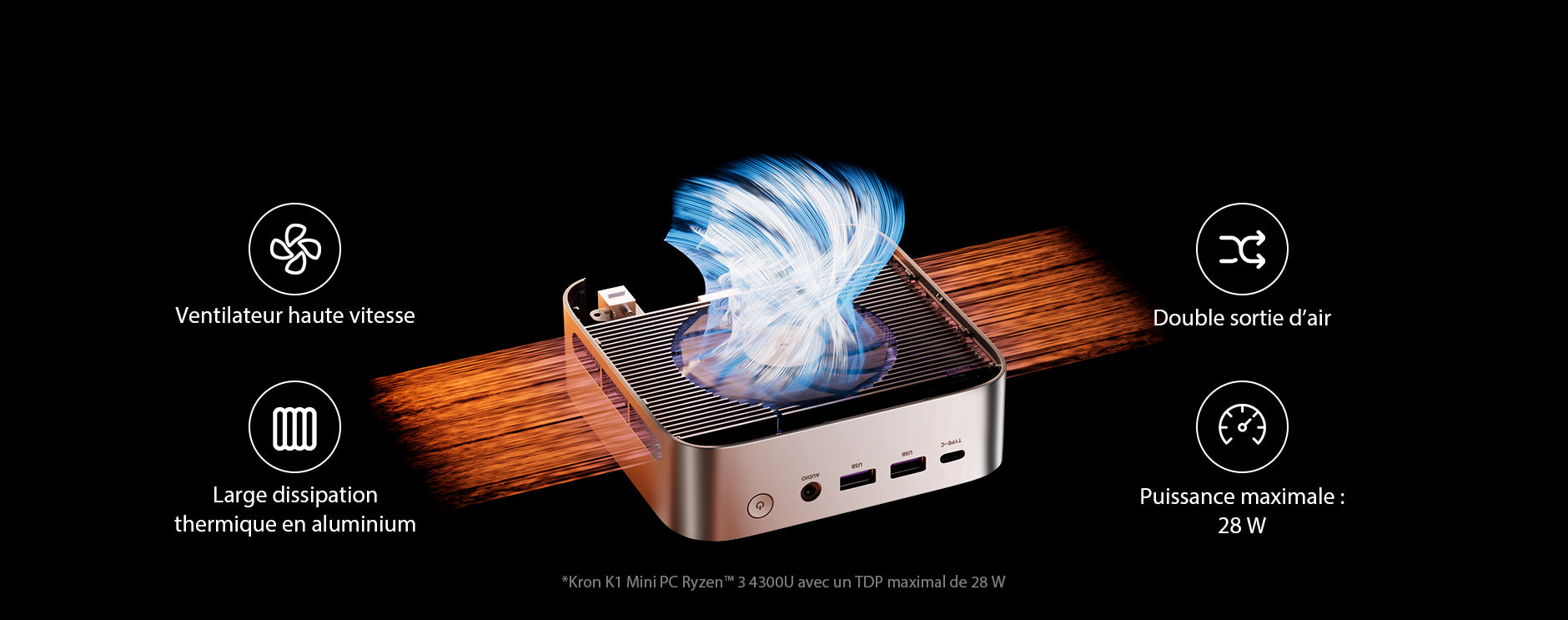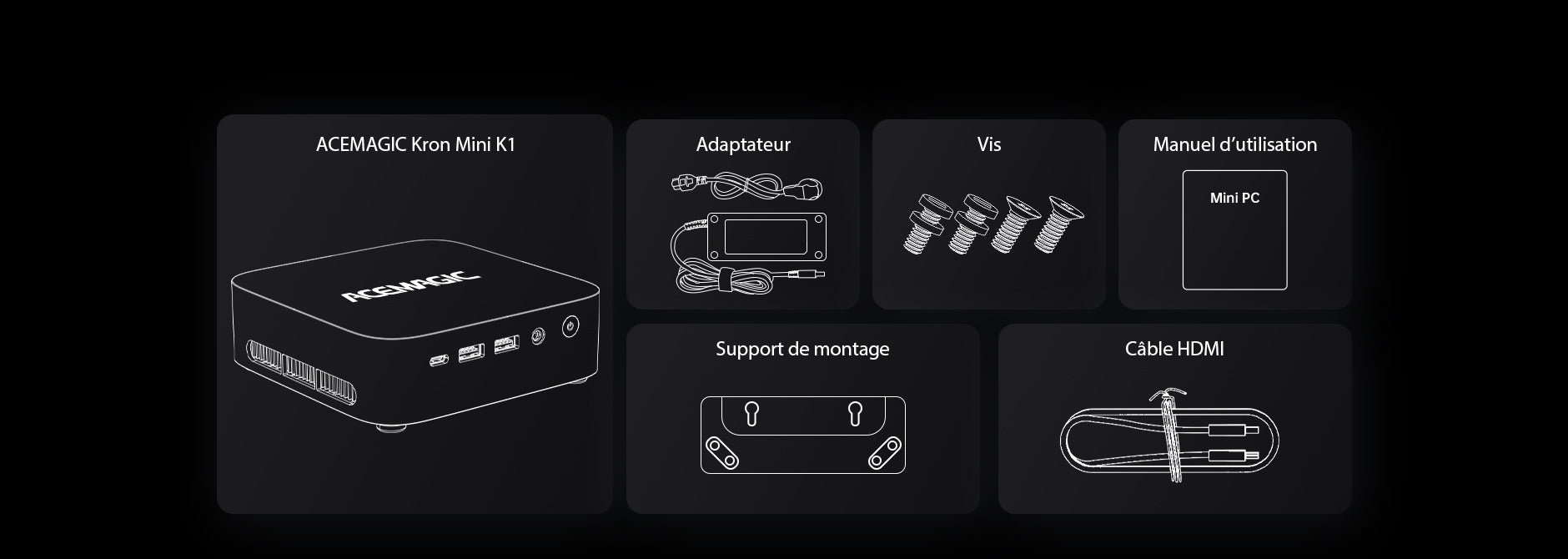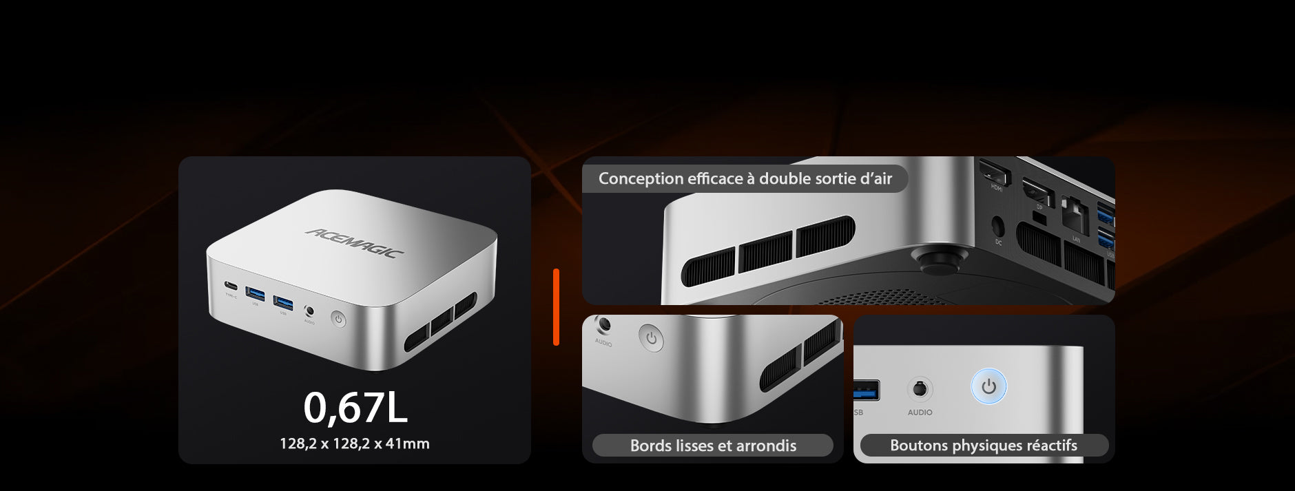 | Ports & boutons | Port Ethernet RJ45 Gigabit adaptatif 10M/100M/1000Mbps ×1 USB 3.2 Gen2 Type-A ×2 (10 Gbps, façade) USB 3.2 Gen1 Type-A ×4 (5 Gbps, arrière) USB 3.2 Gen2 Type-C multifonction (compatible DP 1.4, 4K@60Hz, transfert de données jusqu’à 10 Gbps, sortie PD) ×1 Entrée d’alimentation DC ×1 HDMI 2.0 ×1 (4K@60Hz) DisplayPort 1.4b ×1 (4K@60Hz) Prises audio 3,5 mm ×1 Bouton d’alimentation ×1 |