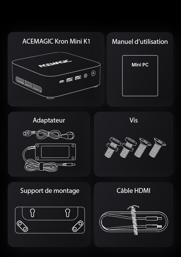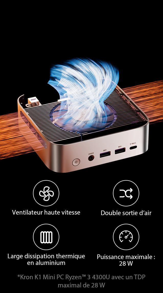 | Ports & boutons | Port Ethernet RJ45 Gigabit adaptatif 10M/100M/1000Mbps ×1 USB 3.2 Gen1 Type-A ×6 (10 Gbps, façade) USB 3.2 Gen1 Type-C (Données + sortie vidéo DP1.4)×1 Entrée d’alimentation DC ×1 HDMI 2.0 ×1 (4K@60Hz) DisplayPort 1.4 ×1 (4K@60Hz) Prises audio 3,5 mm ×1 Bouton d’alimentation ×1 |