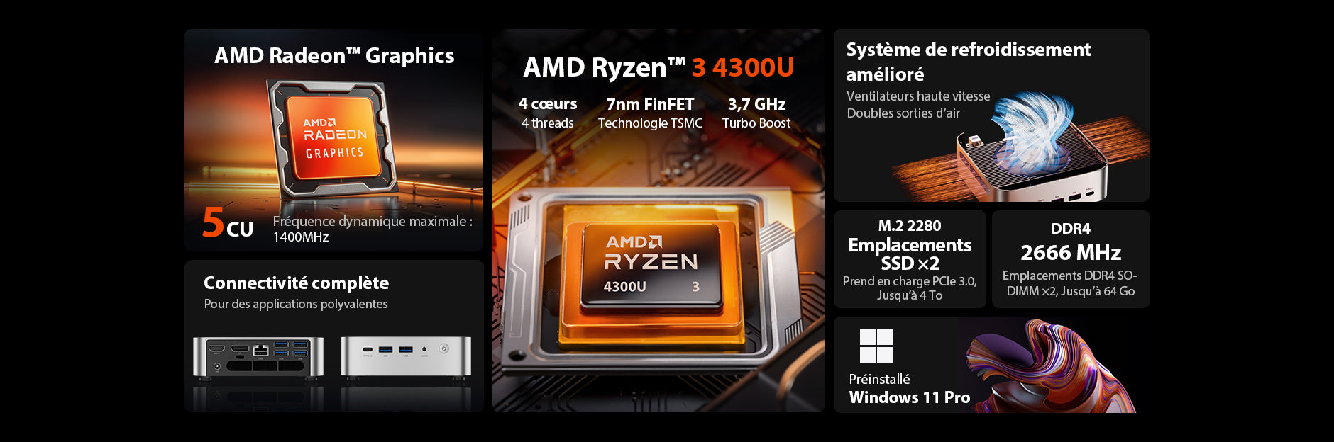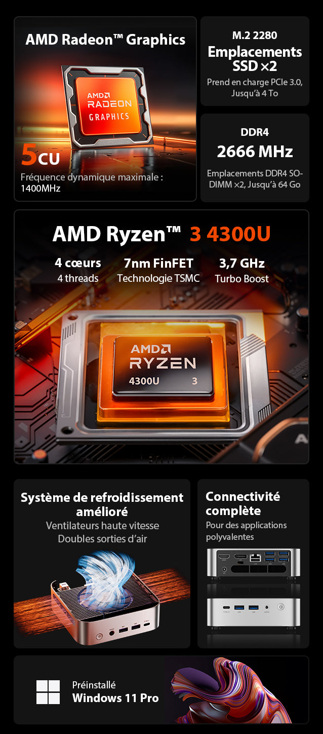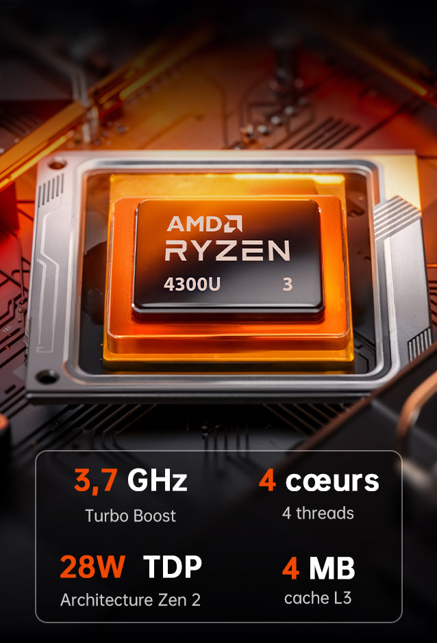 | Processeur | AMD Ryzen™ 5 7430U 6 cœurs / 12 threads architecture Zen3, technologie de gravure TSMC 7 nm FinFET, cache L3 de 16 Mo, fréquence de base 2,3 GHz, fréquence Turbo jusqu’à 4,3 GHz |