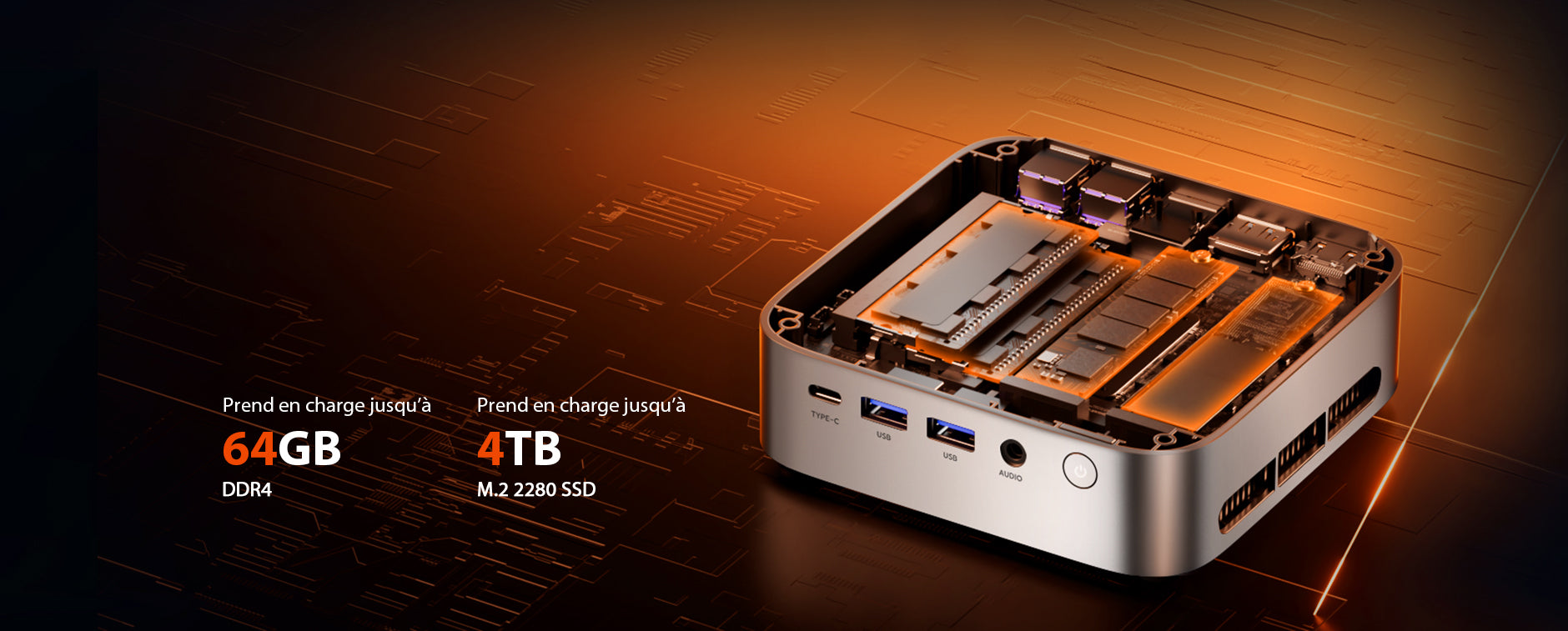 | Stockage | 1TB M.2 2280 SATA SSD, 2 emplacements M.2 2280 (1 emplacement M.2 2280 SATA & NVMe PCIe 3.0 ×2, 1 emplacement M.2 2280 NVMe PCIe 3.0 ×4, prenant en charge une capacité maximale combinée de 4 TB) |