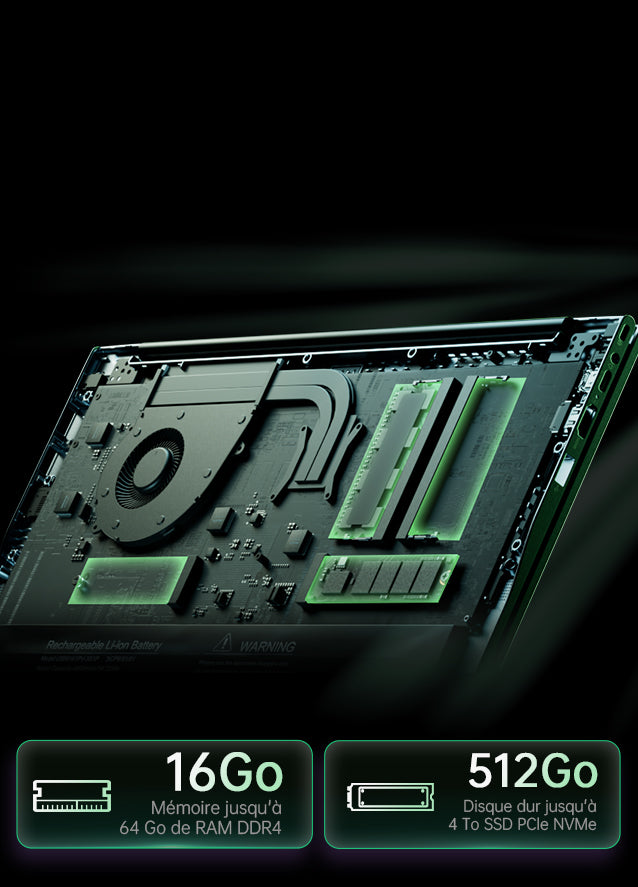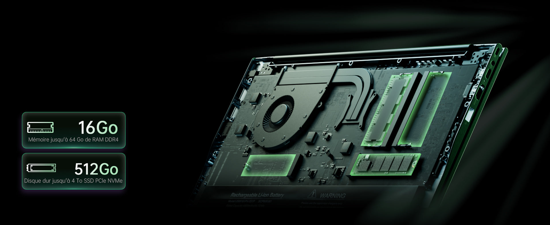 | Mémoire vive (RAM) | 16 GB DDR4, 2666 MHz (DDR4 SO-DIMM Slots×2, jusqu'à 64 GB) |