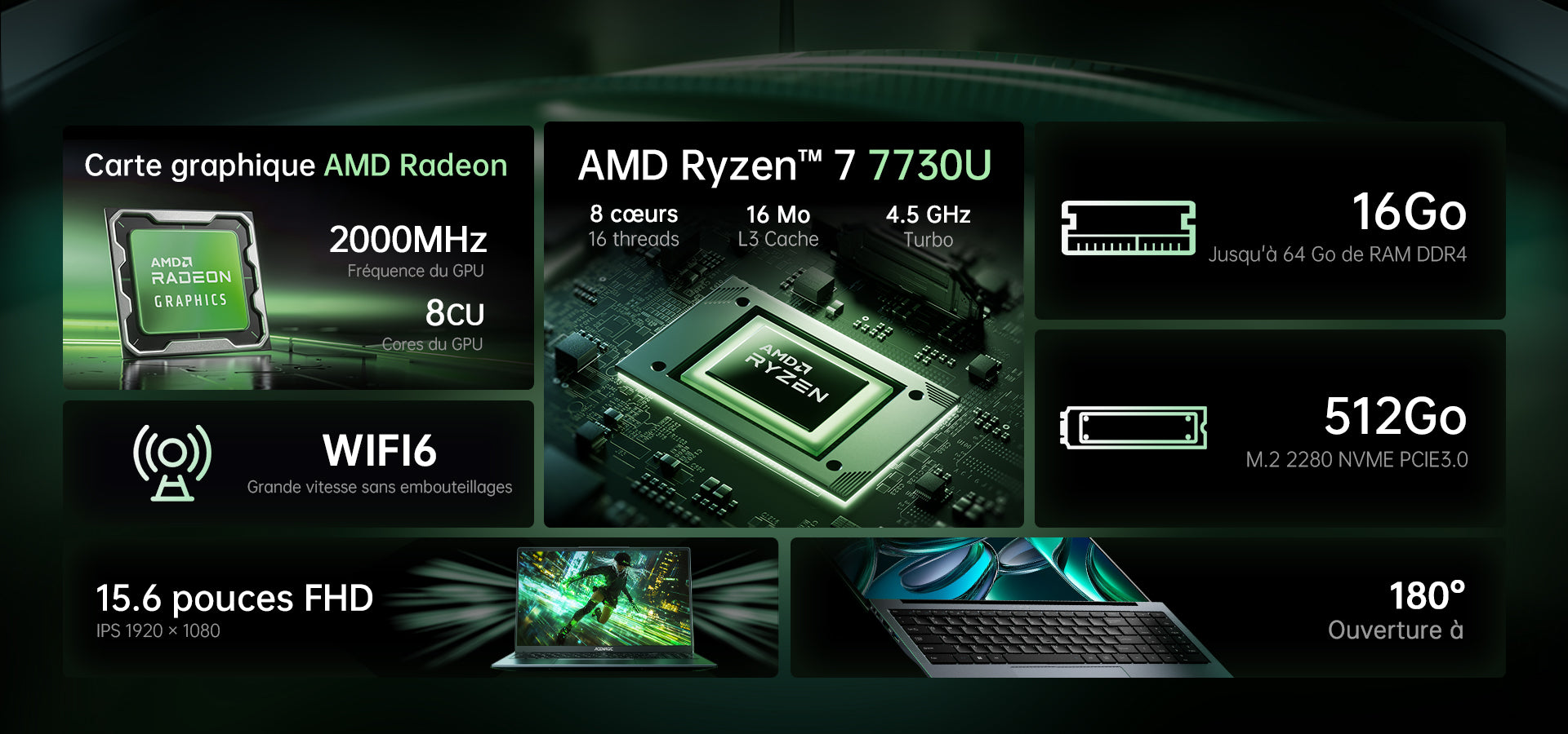 Le nouvel ordinateur portable ACEMAGIC LX15Pro est équipé d'un processeur AMD Ryzen 7 5700U cadencé entre 1,8 GHz et 4,3 GHz. 16 GB de RAM DDR4 et un SSD de 512 GB garantissent un fonctionnement fluide au quotidien, la RAM étant extensible jusqu'à 64 GB et le SSD jusqu'à 4 TB. Un écran IPS de 15,6 pouces au format 16:9 optimise la productivité et la navigation.
