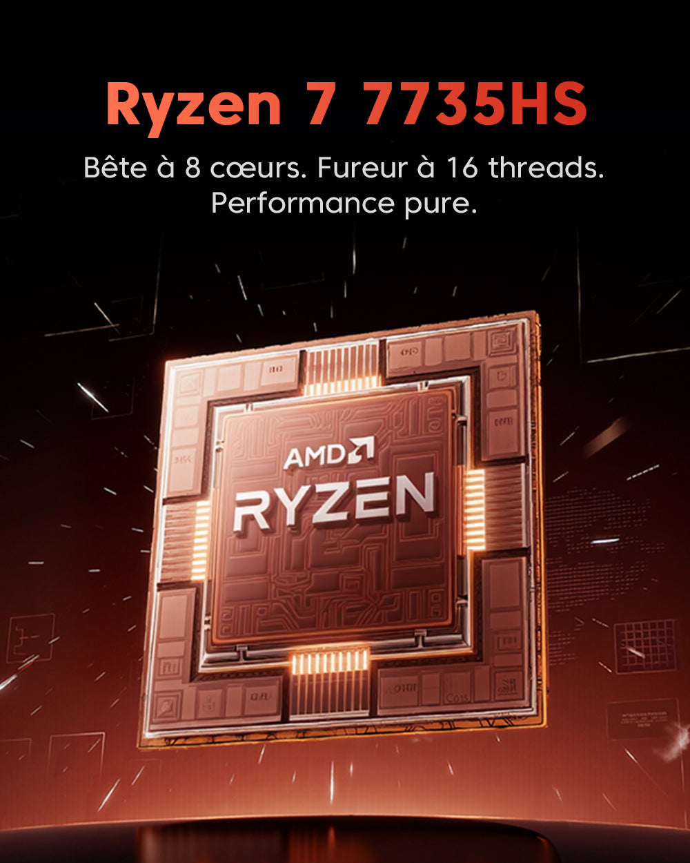 | Processeur | AMD Ryzen™ 7 7735HS 8 cœurs/16 threads 3,2 GHz – 4,75 GHz architecture Zen3+, processus de fabrication TSMC 6 nm FinFET, cache L3 de 16 MBz |