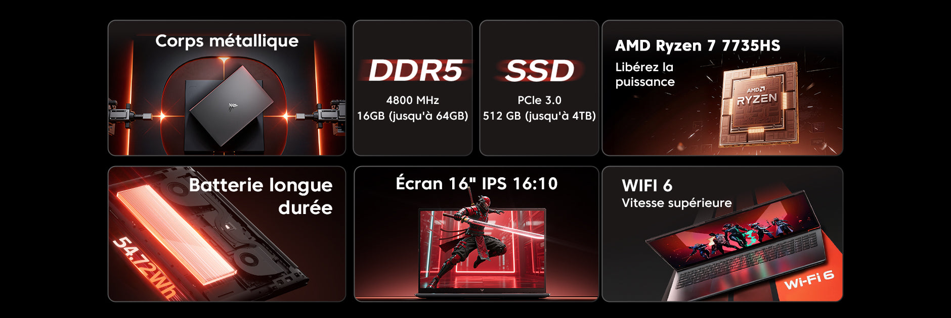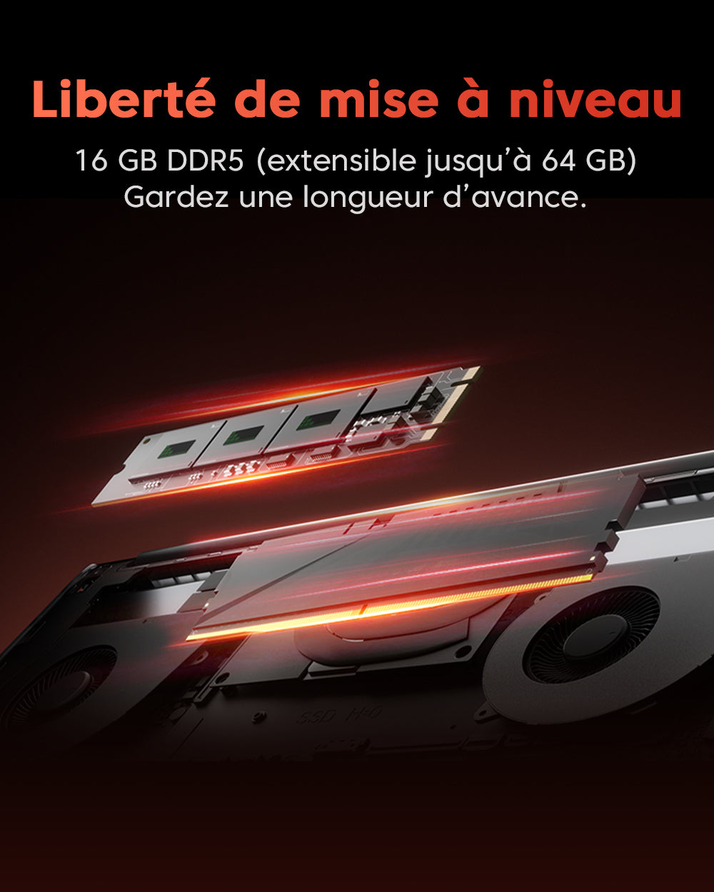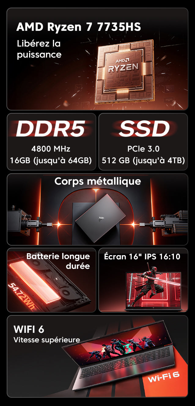 | Mémoire vive (RAM) | 16GB DDR5 4800MHz (DDR5 SO-DIMM Slots×2, jusqu'à 64GB) |