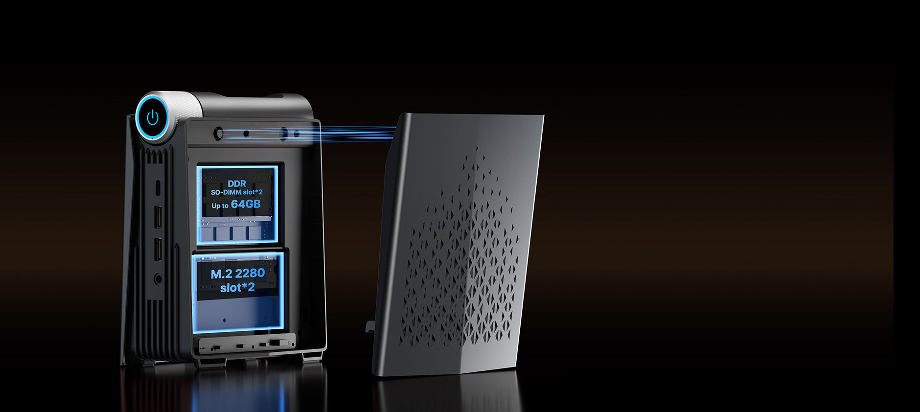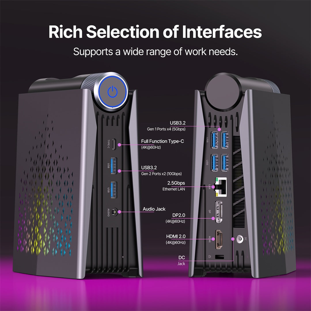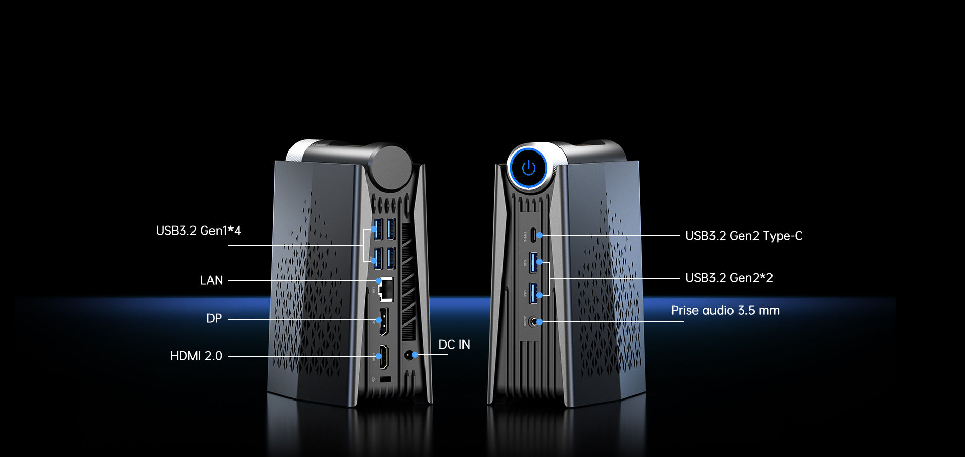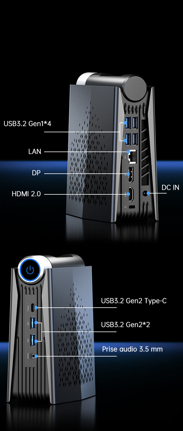 | Ports & boutons | Port Ethernet RJ45 Gigabit 10 M/100 M/1000 M/2,5 Gbps ×1 USB 3.2 Gen2 Type-A ×2 (avant) USB 3.2 Gen1 Type-A ×4 USB 3.2 Gen2 Type-C ×1 (compatible DP 1.4, 4K@60Hz, sortie PD) Entrée d’alimentation DC ×1 HDMI 2.0 ×1 (4K@60Hz) DisplayPort 2.0 ×1 (4K@60Hz) Prise audio 3,5 mm ×1 Bouton d’alimentation ×1 |