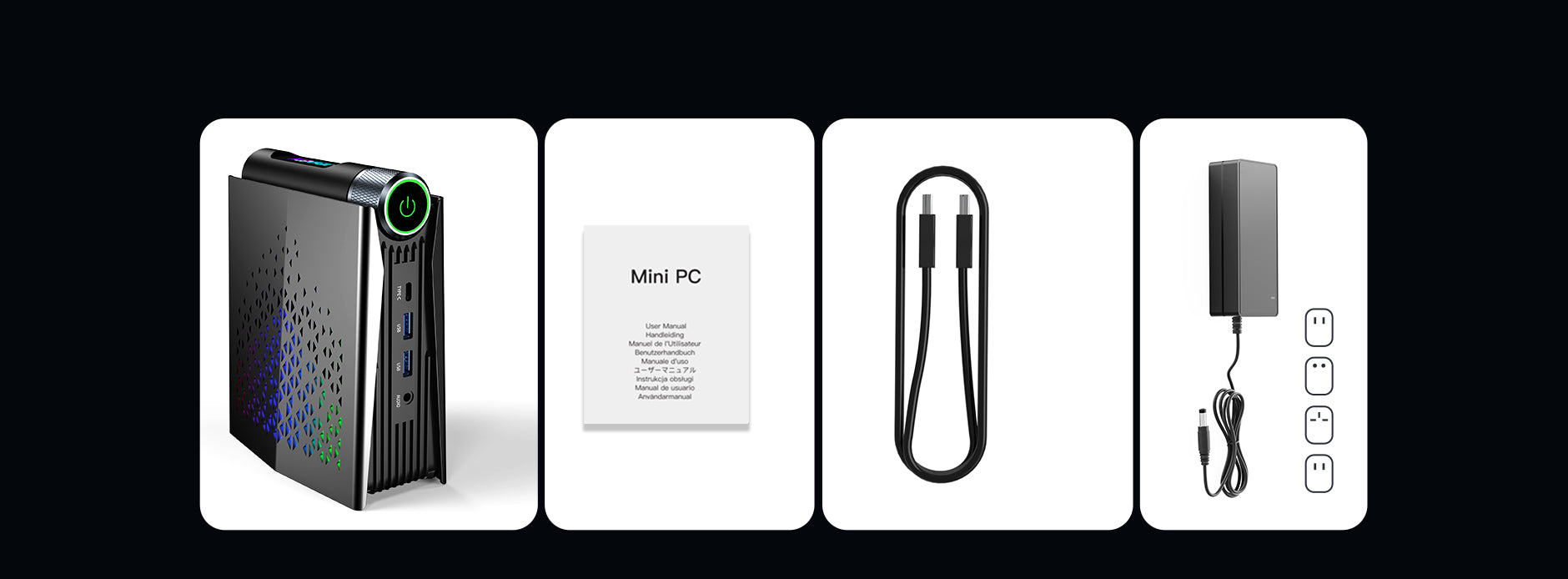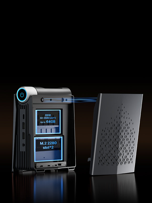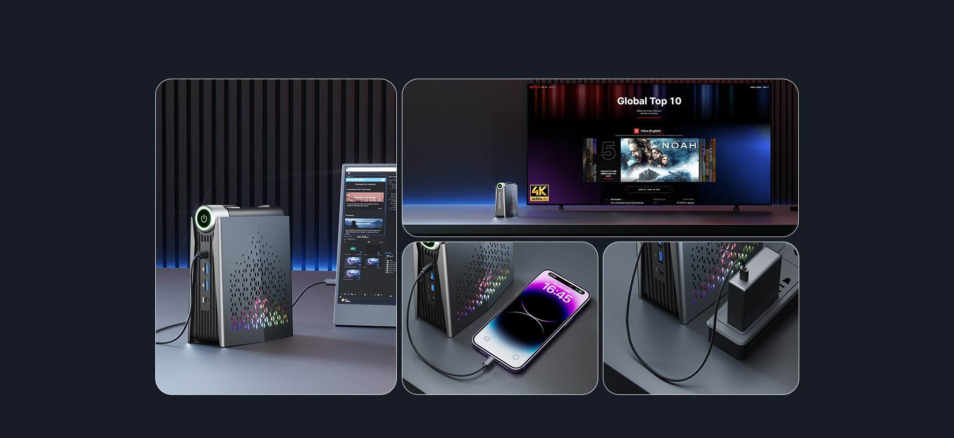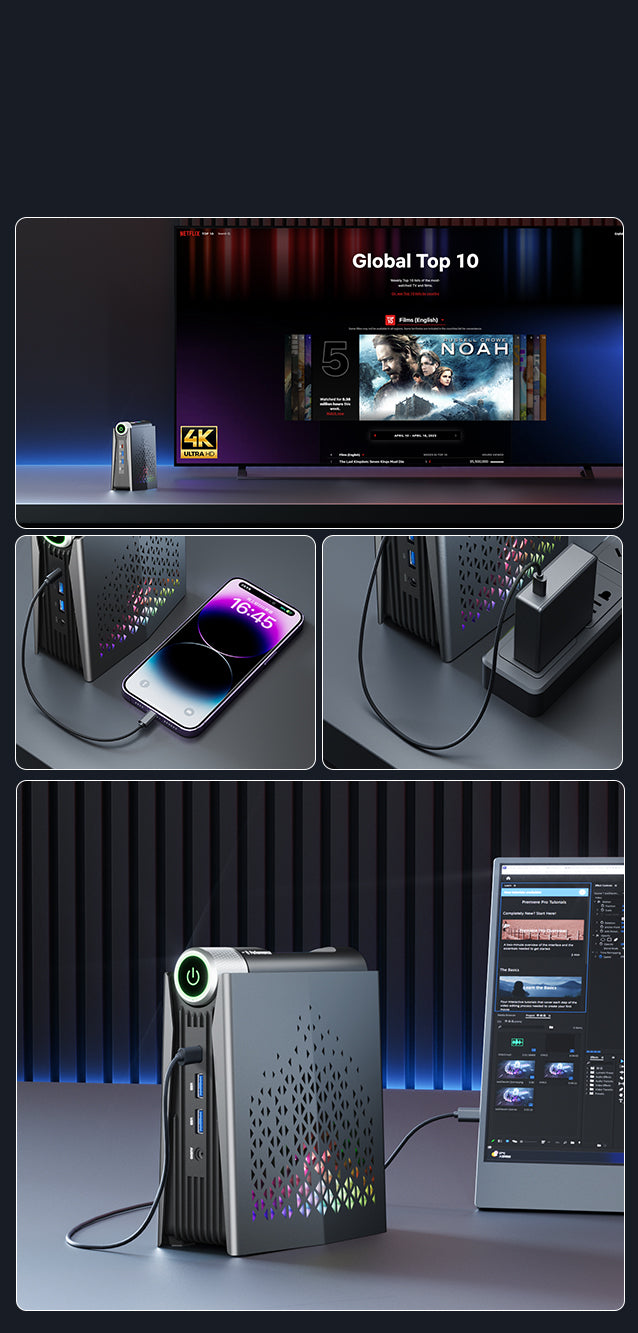| Ports & boutons | Port Ethernet RJ45 Gigabit 10 M/100 M/1000 M/2,5 Gbps ×1 USB 3.2 Gen2 Type-A ×2 (avant) USB 3.2 Gen1 Type-A ×4 USB 3.2 Gen2 Type-C ×1 (compatible DP 1.4, 4K@60Hz, sortie PD) Entrée d’alimentation DC ×1 HDMI 2.0 ×1 (4K@60Hz) DisplayPort 2.0 ×1 (4K@60Hz) Prise audio 3,5 mm ×1 Bouton d’alimentation ×1 |