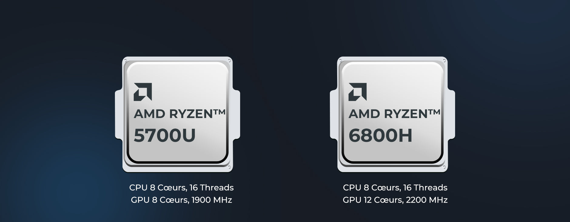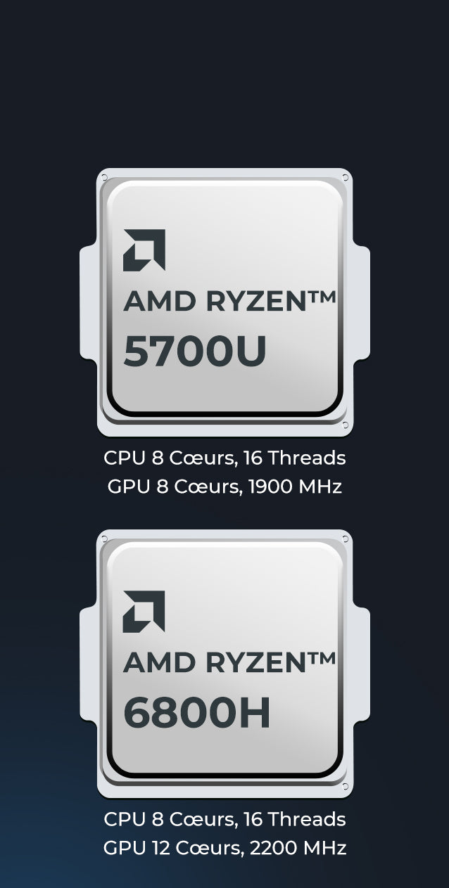 | Processeur | AMD Ryzen™ 7 6800H 8 cœurs / 16 threads (architecture Zen3+, procédé TSMC 6 nm FinFET, cache L3 de 16 MB, fréquence de base 3,2 GHz, fréquence Turbo jusqu’à 4,7 GHz) |