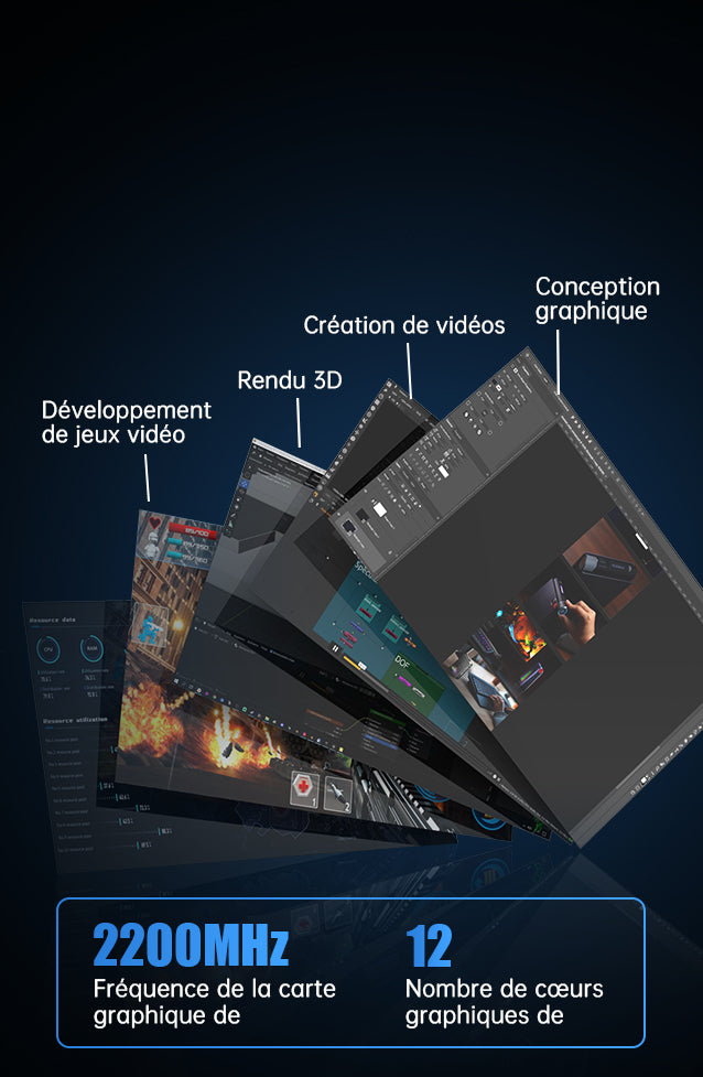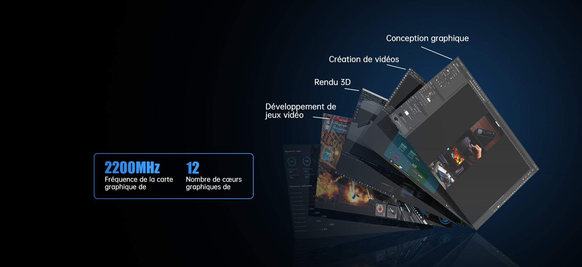 AMD Radeon™ 680M (fréquence graphique : 2200 MHz, architecture RDNA 3, 12 cœurs graphiques) |