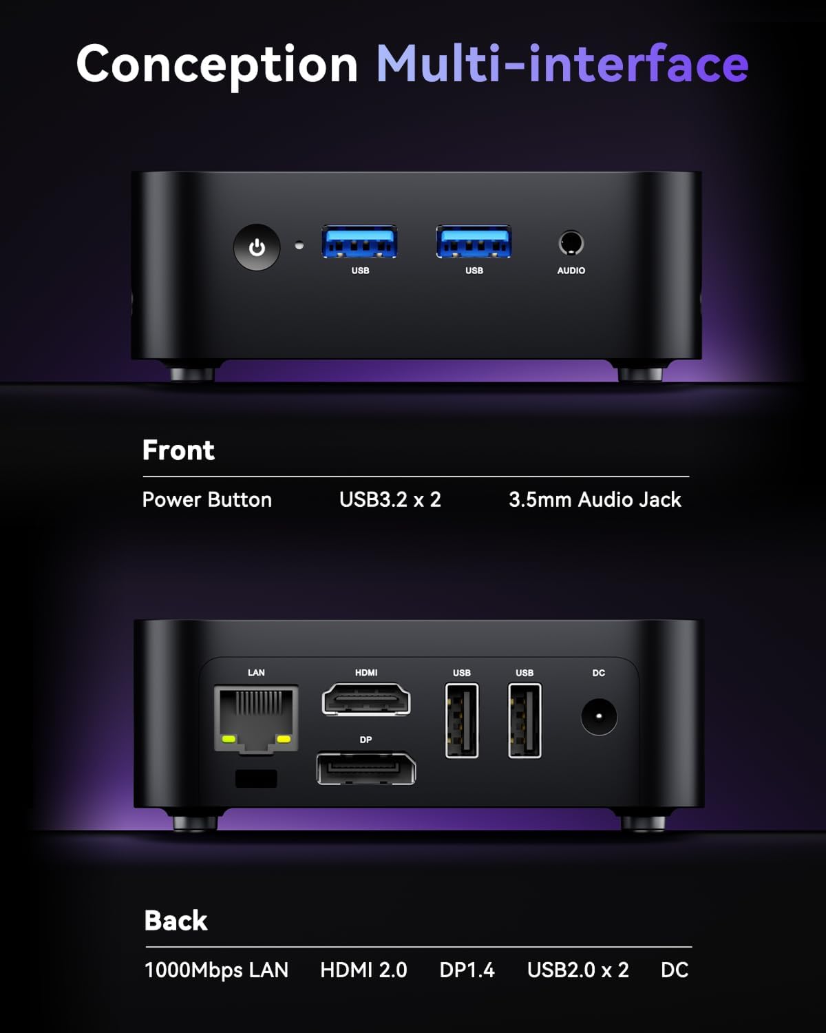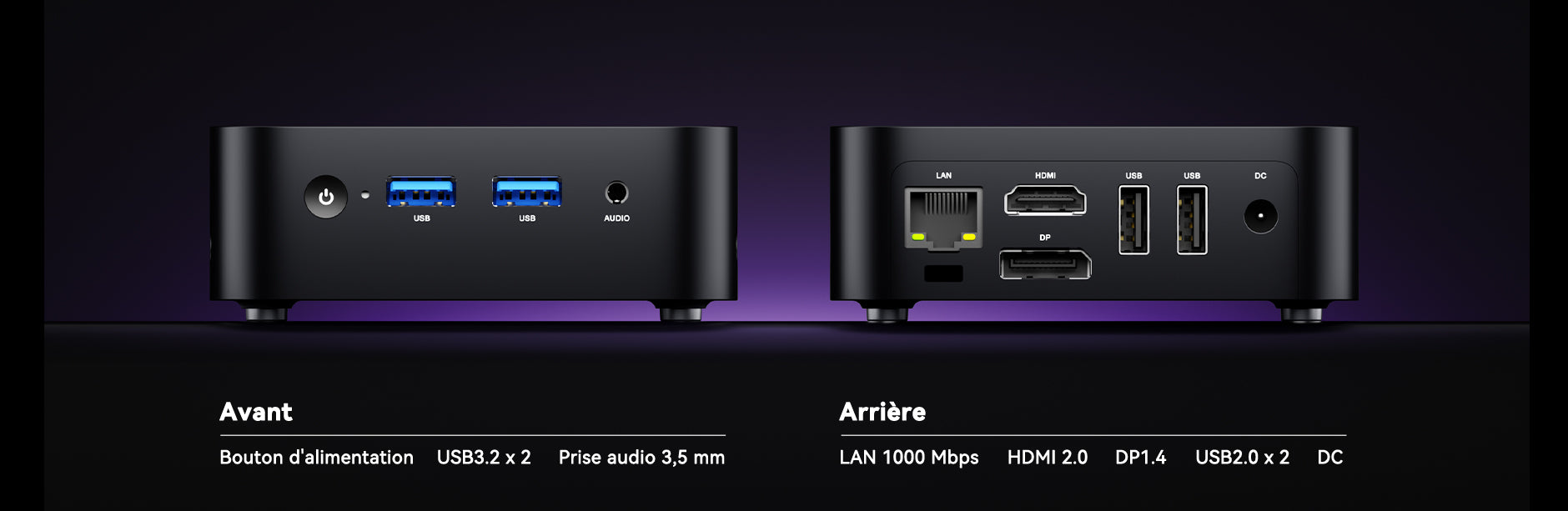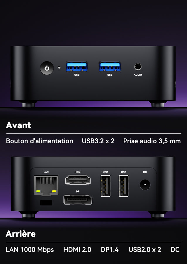 Ethernet RJ45 Gigabit adaptatif 10 M/100 M/1000 M*1E USB 3.2 Gen 2 Type-A*2 USB 2.0 Type-A*2 Prise DC*1 HDMI 2.0*1 (4K@60Hz) DP 1.4*1 (4K@60Hz) Prise audio 3,5 mm*1 Bouton d’alimentation ×1 |
