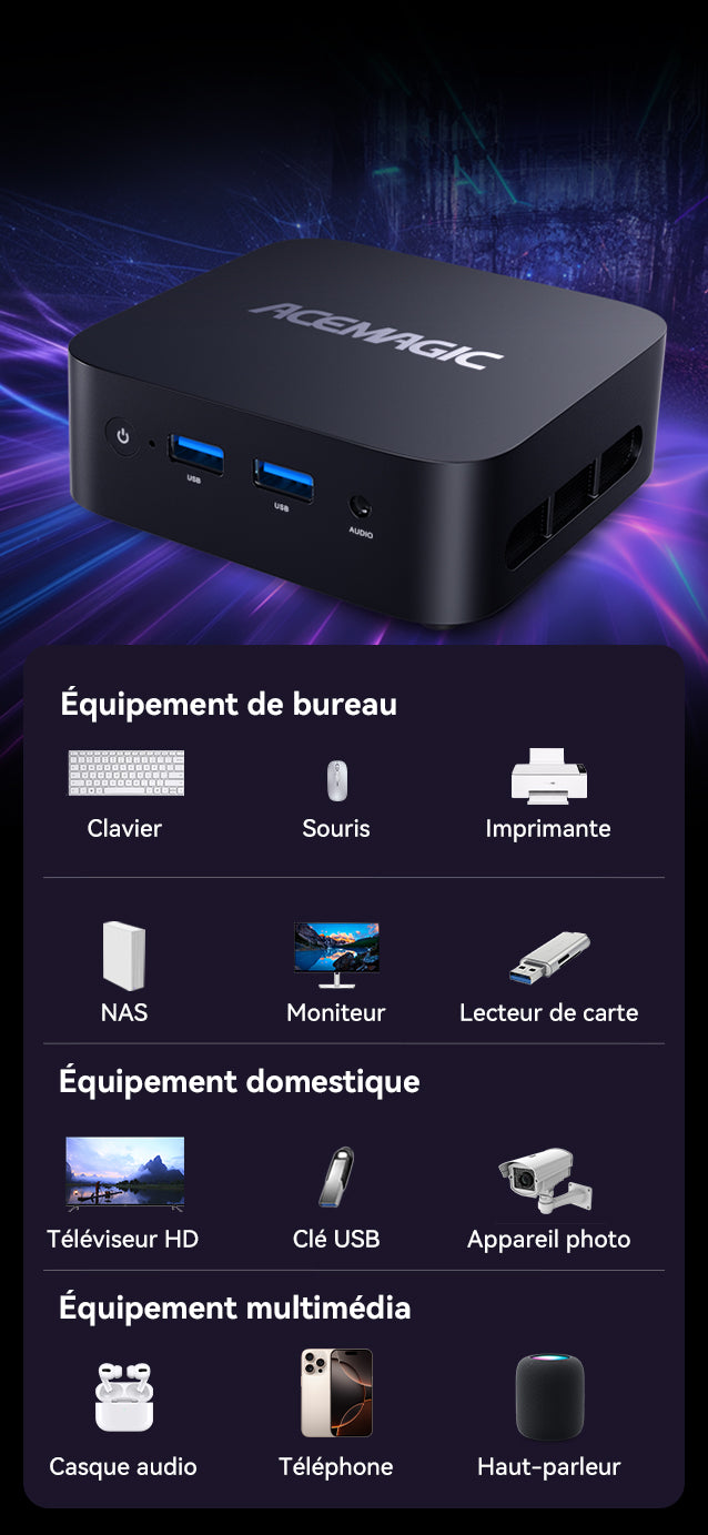 Ce mini PC Vista V1 est petit mais très efficace. Je l’utilise avec deux écrans pour la bureautique et la navigation internet. Silencieux et fiable.