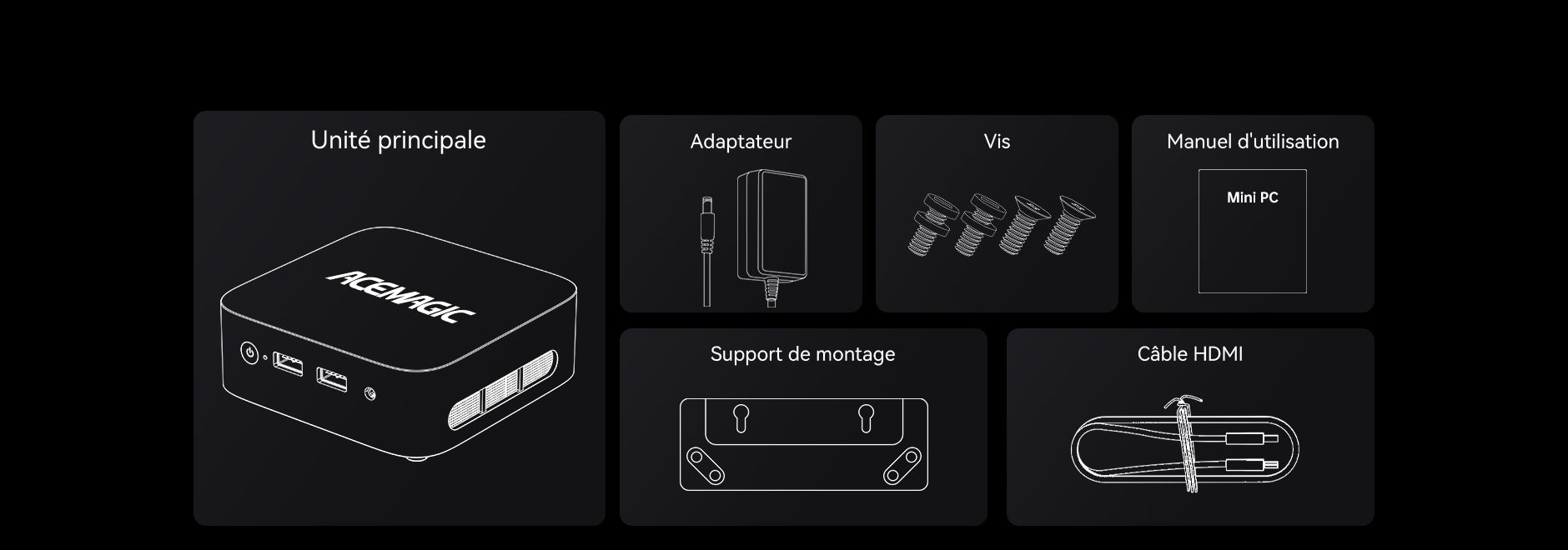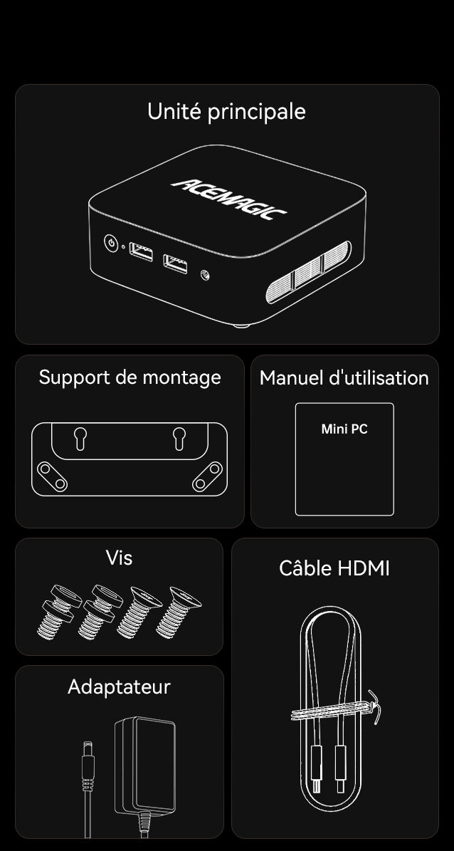 Pour retourner un article, contactez le service clientèle d'ACEMAGIC pour lancer la procédure de retour. Indiquez le motif du retour et fournissez une facture ou une capture d'écran pour confirmer le numéro de commande. Le service d'assistance d'ACEMAGIC vous communiquera l'adresse de retour correspondante dans un délai de 24 heures ouvrables. Afin que votre remboursement soit traité immédiatement, envoyez à ACEMAGIC une notification de retour contenant les informations suivantes : • Nom du service de messagerie • Numéro de suivi