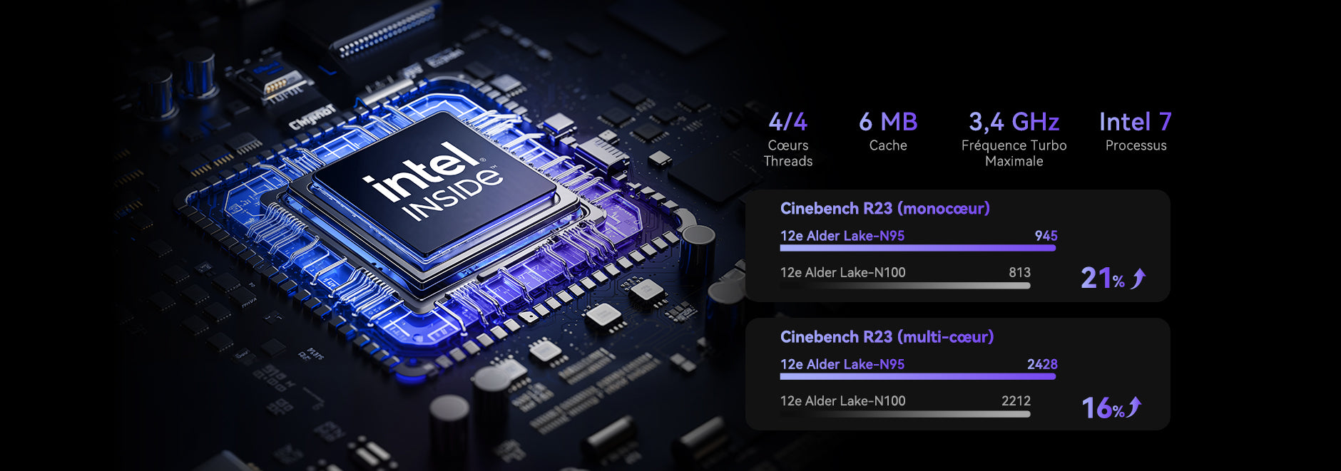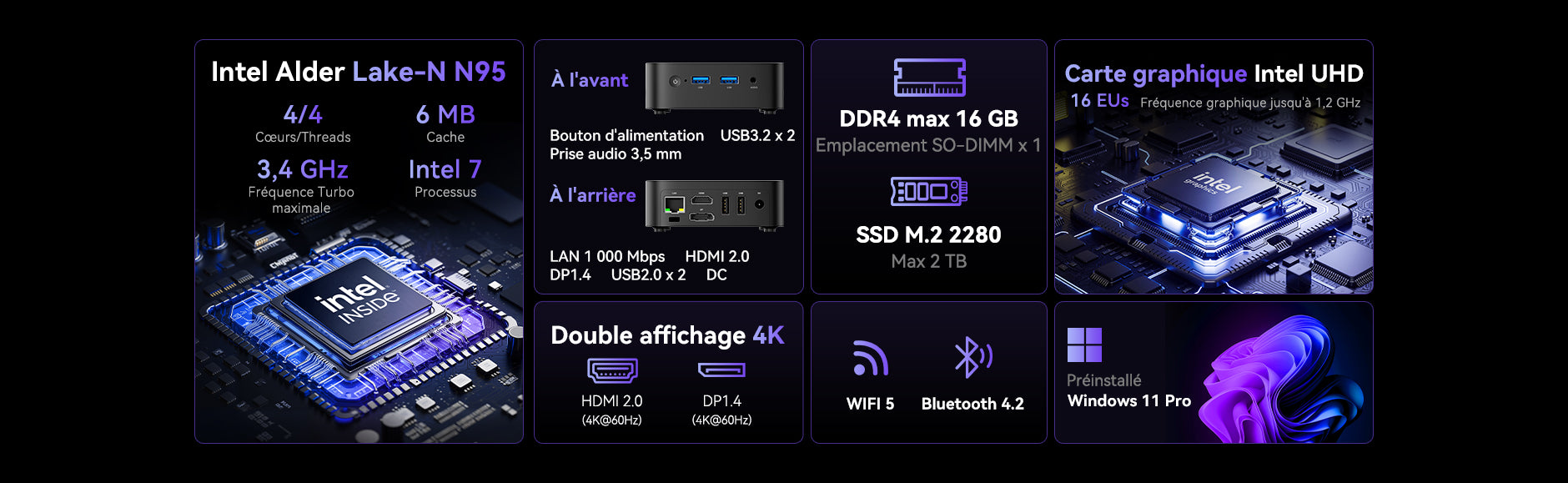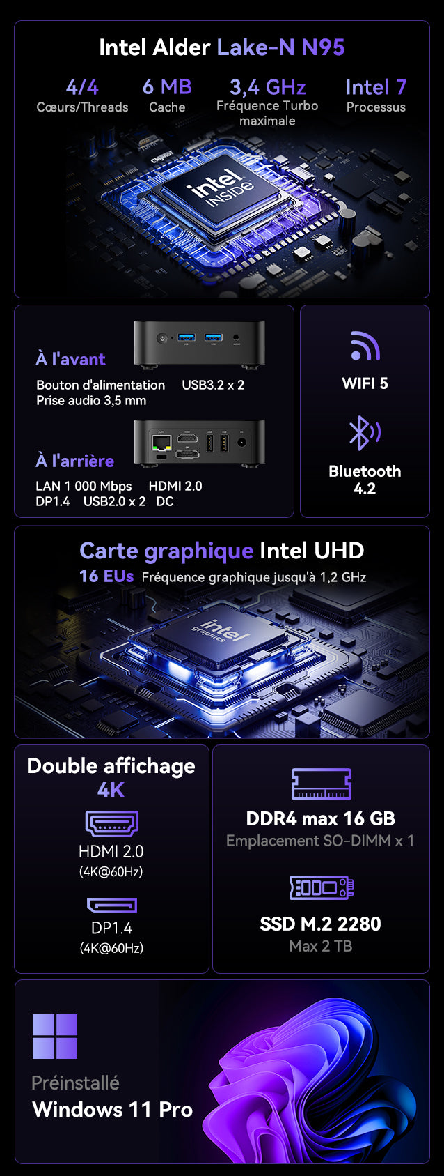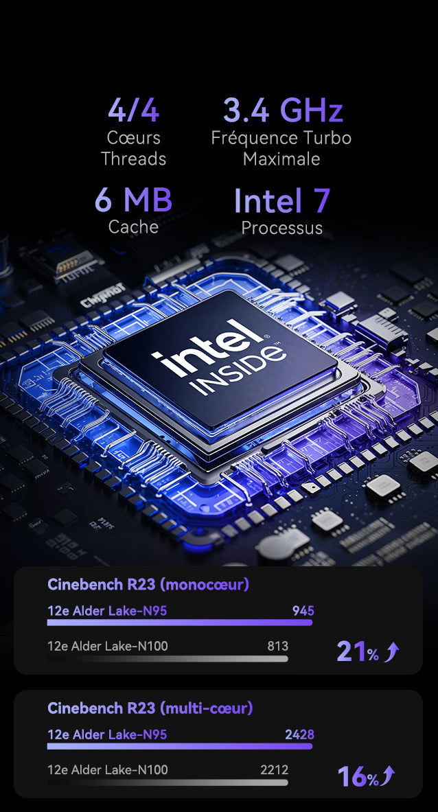 | Processeur | Intel® Alder Lake-N N95 4 cœurs / 4 threads (technologie Intel 7, cache intelligent 6 Mo, fréquence de base 1,7 GHz, fréquence Turbo jusqu’à 3,4 GHz) |