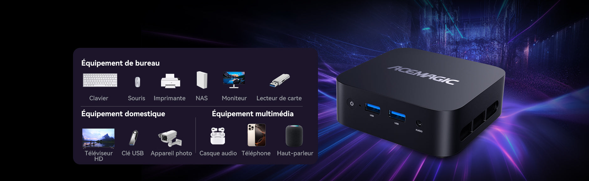 | Sorties audio | HDMI 2.0*1(4K@60Hz) DP 1.4*1(4K@60Hz) Prise audio 3,5 mm*1 |