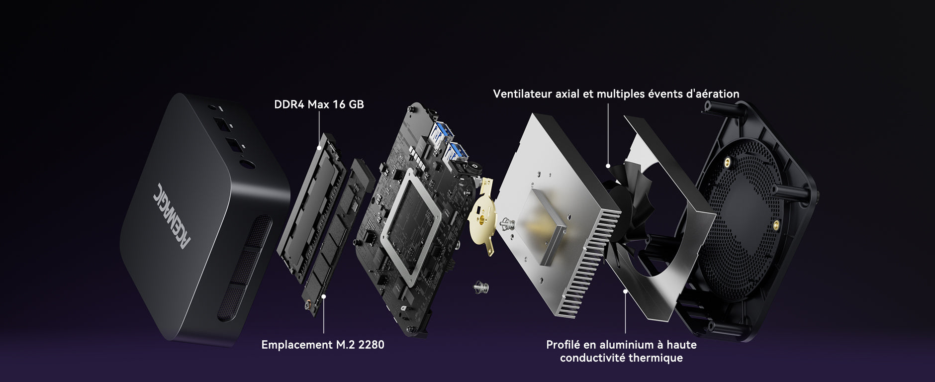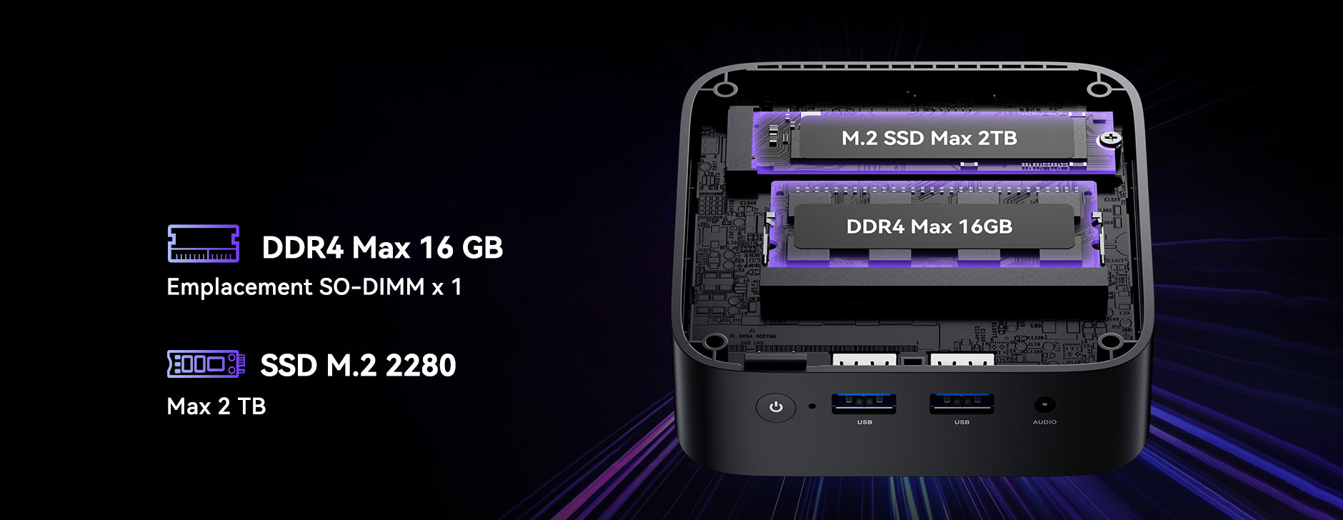 | Stockage | SSD M.2 2280, emplacement M.2 2280*1 (NVMe/SATA), jusqu’à 2 To |